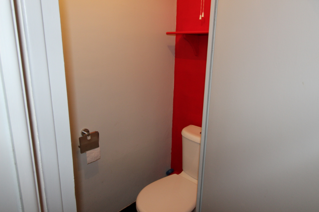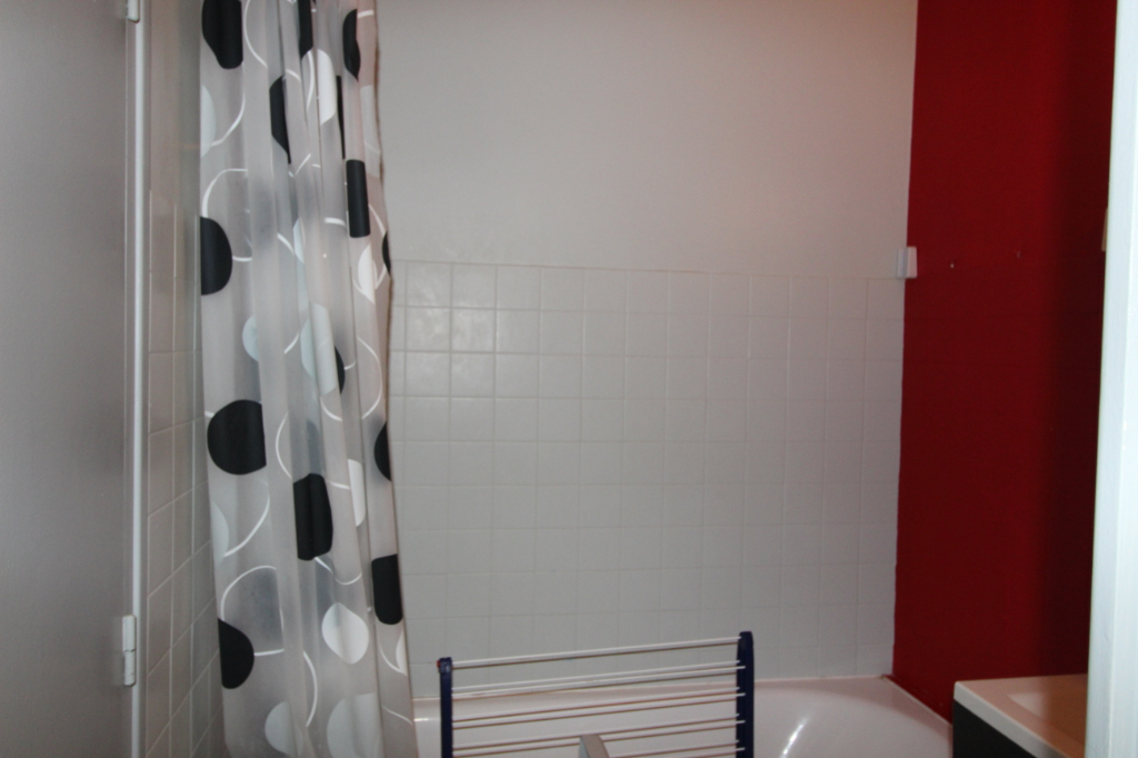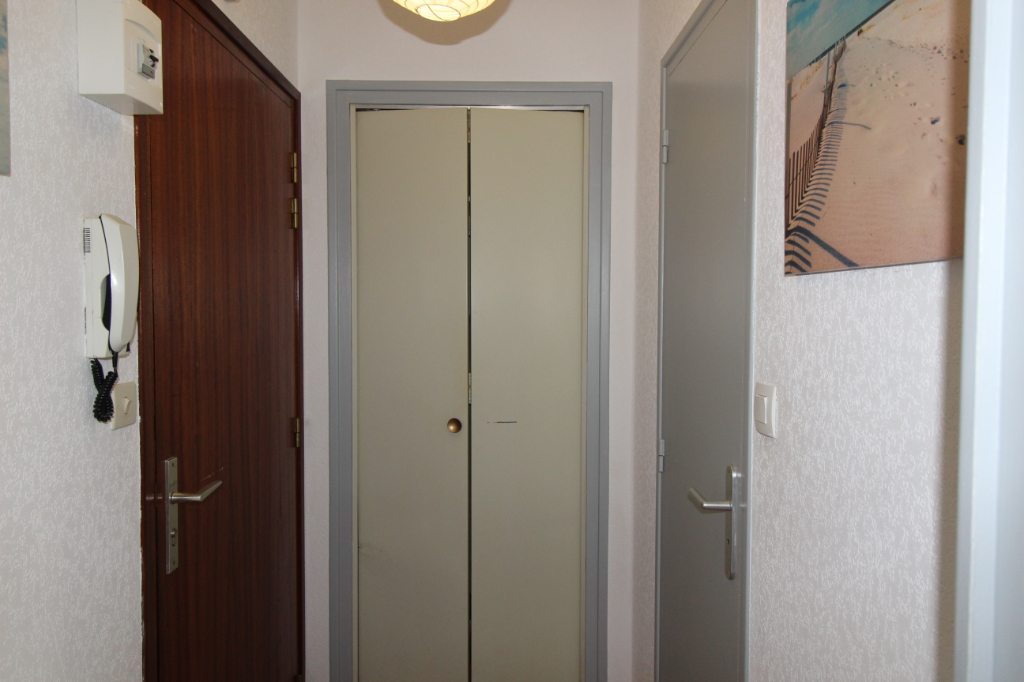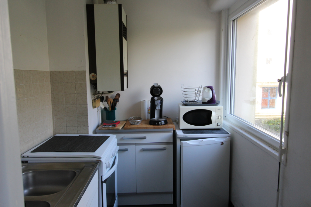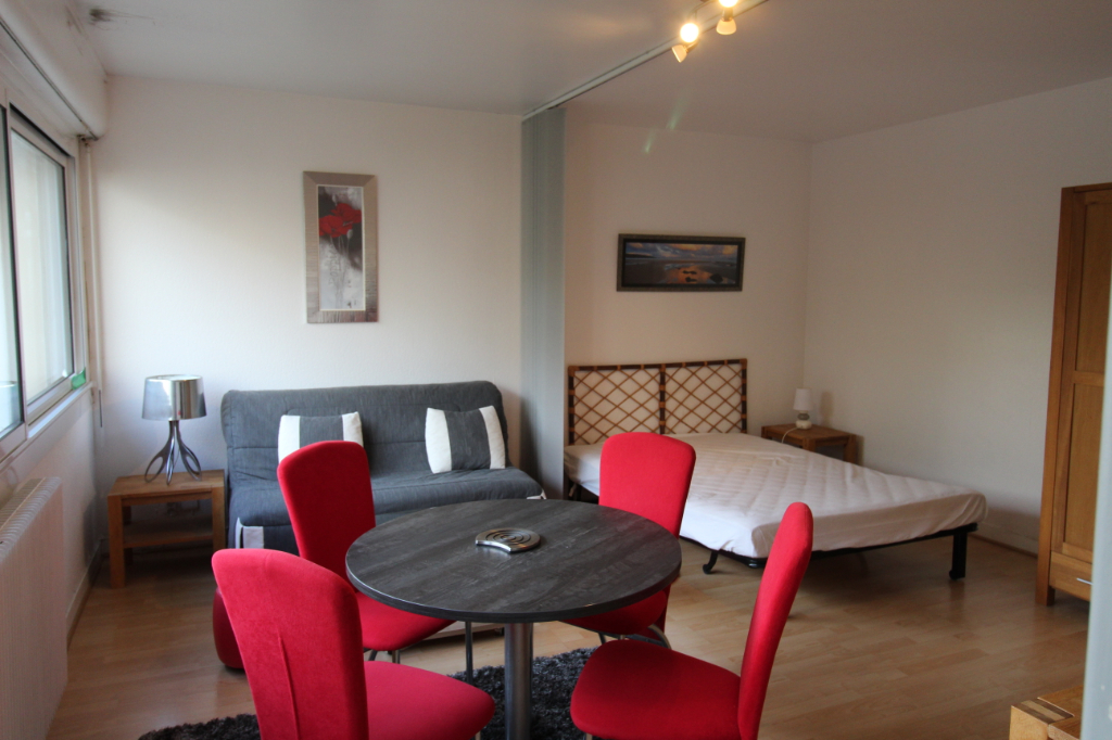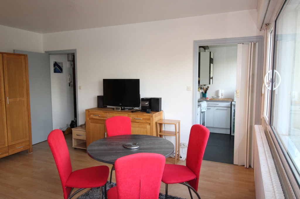 Studio composé d’une entrée avec placard, une salle de bains rénovée avec goût, un wc, une pièce de vie lumineuse et une cuisine aménagée et équipée.