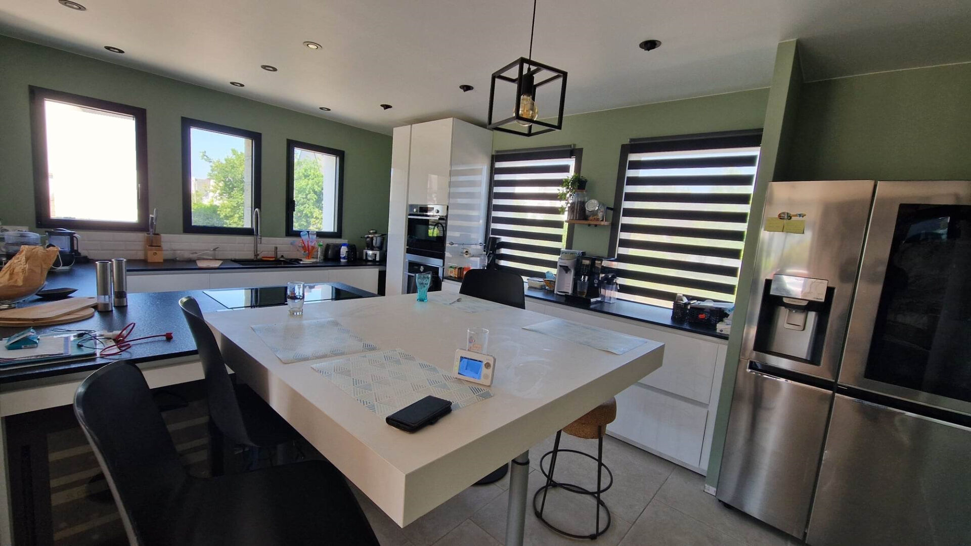 La maison propose au rez-de-chaussée une vie de plain-pied. A ce niveau, une entrée ouvrant d’un côté sur un salon lumineux équipé d’un poêle à granules disposant de deux terrasses, une salle à manger, une cuisine ouverte avec îlot central. Une partie nuit avec une chambre et sa salle de bain et toilette séparé, un dressing.