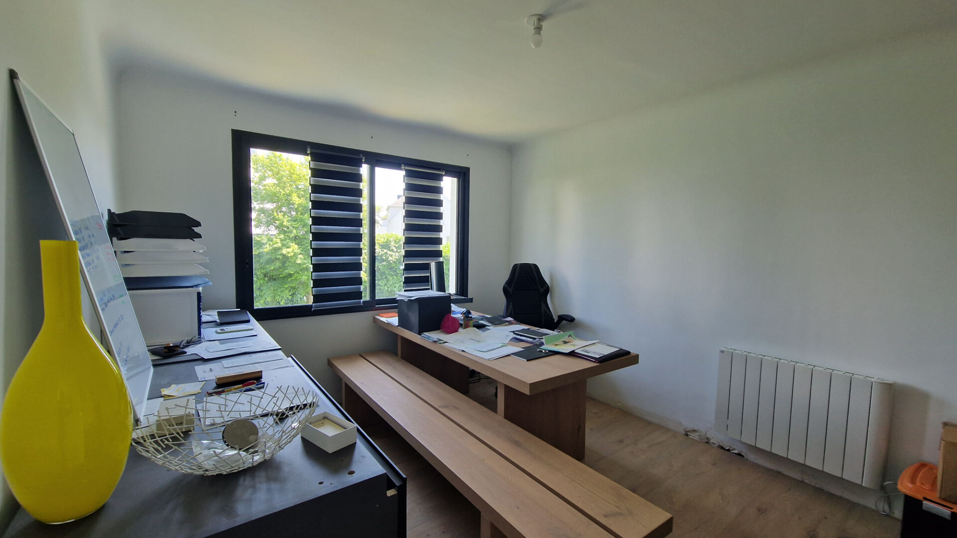 A l’étage, trois chambres avec placards, salle de bain, espace repassage et mezzanine faisant office de bureau.