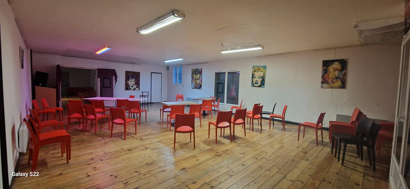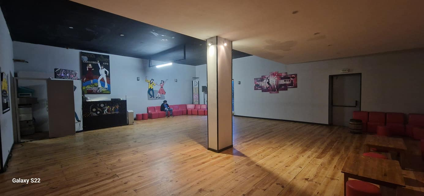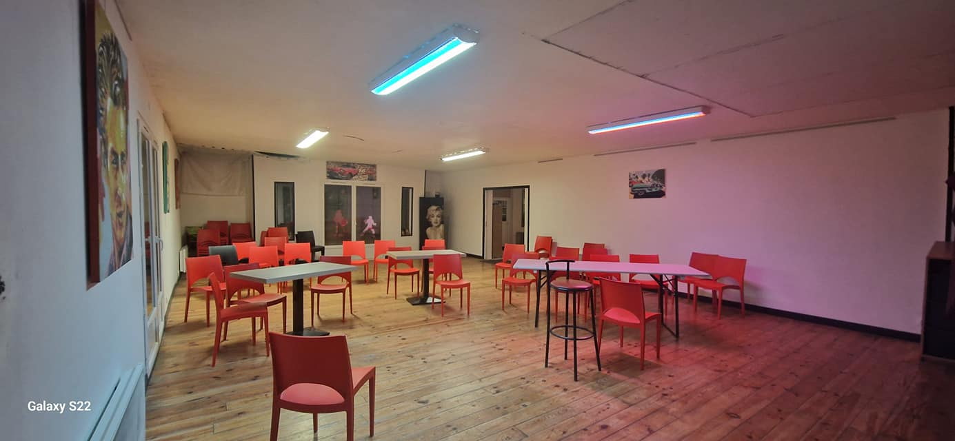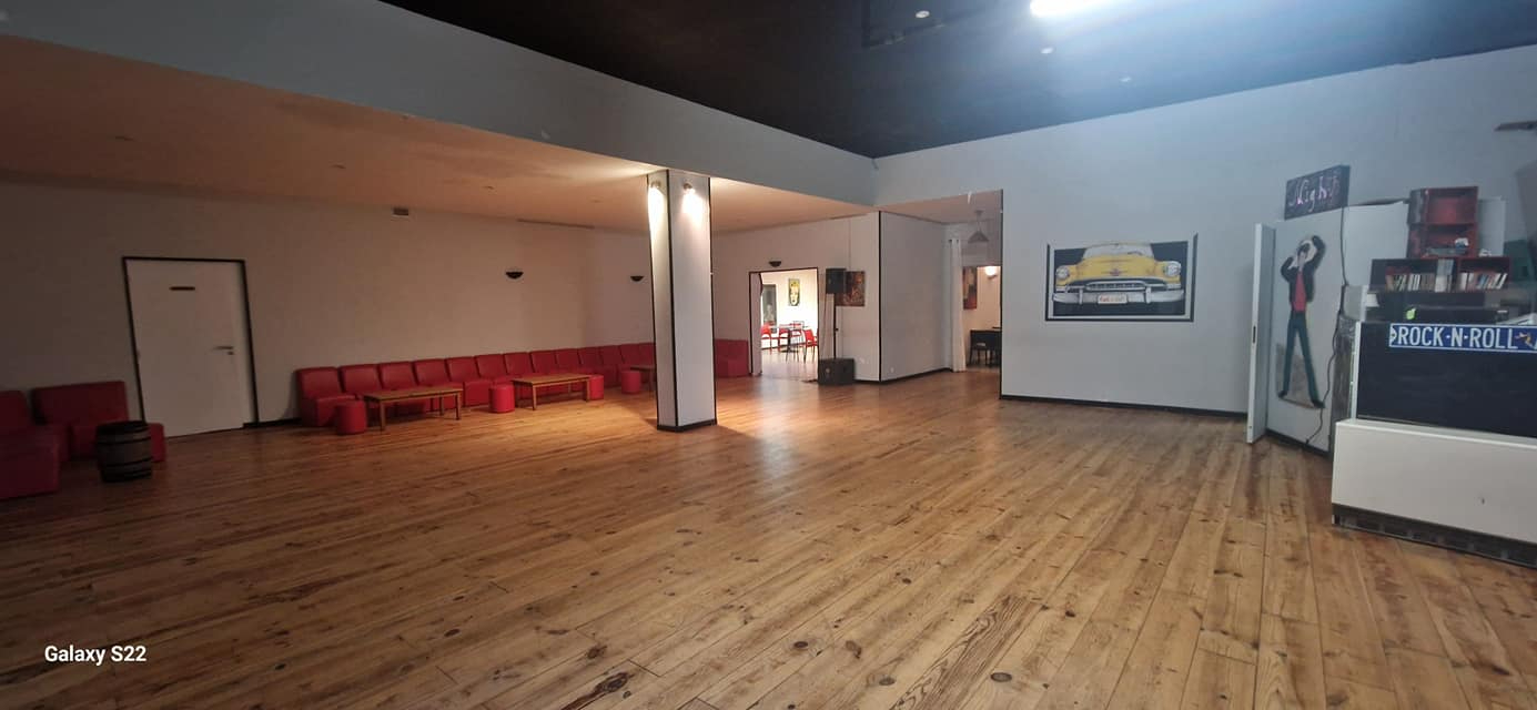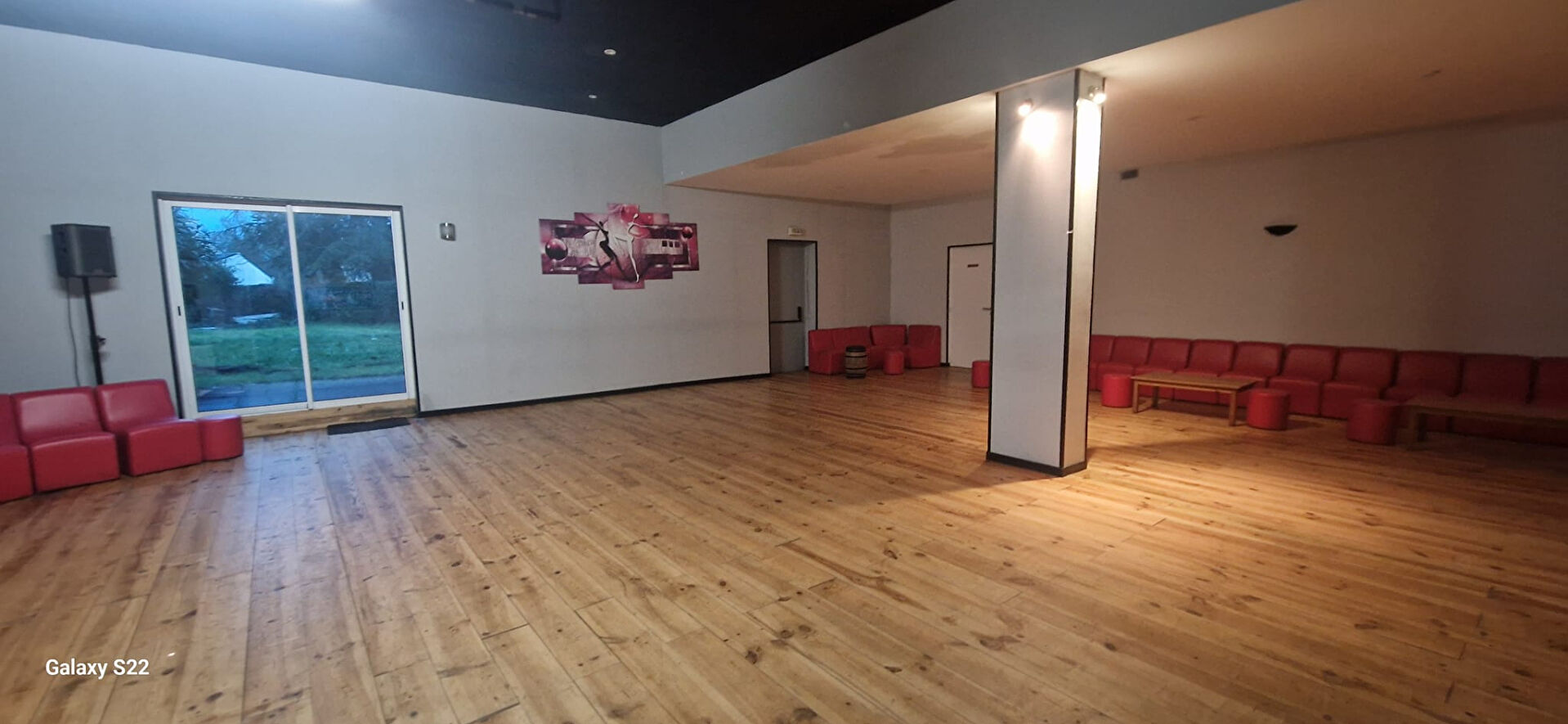 Le hangar se compose d’une salle avec un bar de 66m², ainsi que de deux autres pièces sur plancher bois de 85m² et 120m² respectivement. Il comprend également une réserve, une cuisine professionnelle équipée et aménagée, ainsi qu’une pièce comprenant deux toilettes et un lavabo avec accès pour les personnes à mobilité réduite.