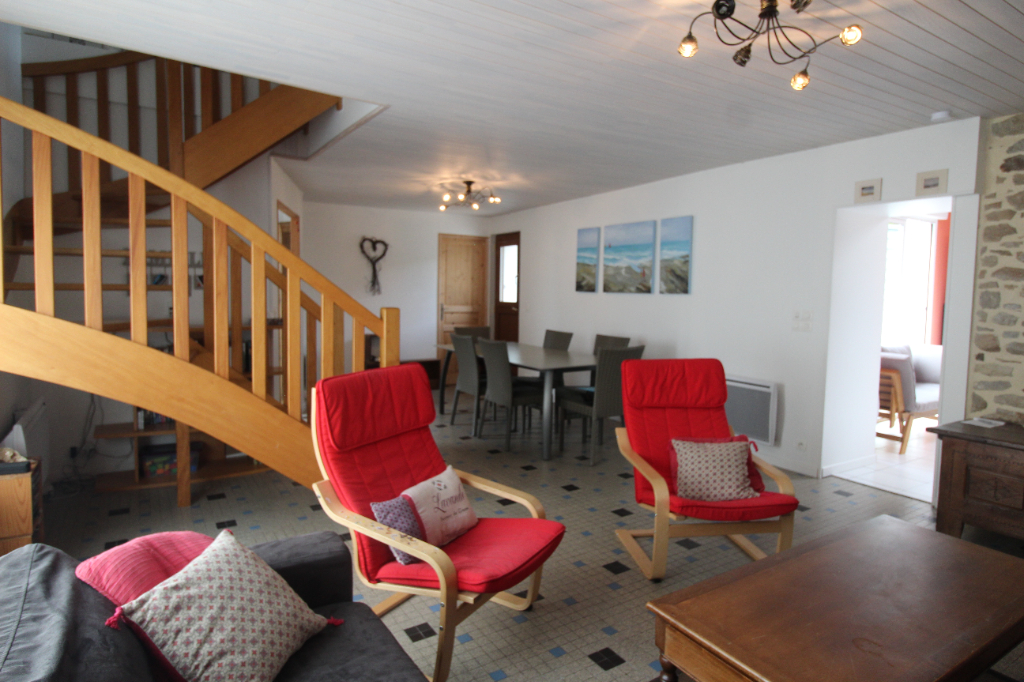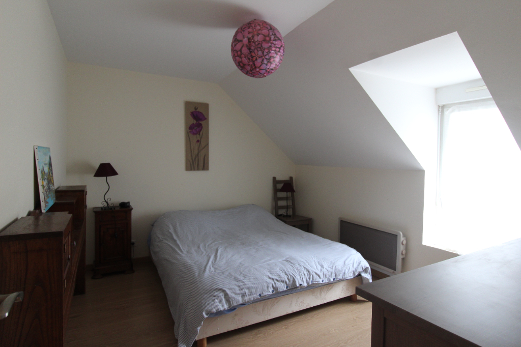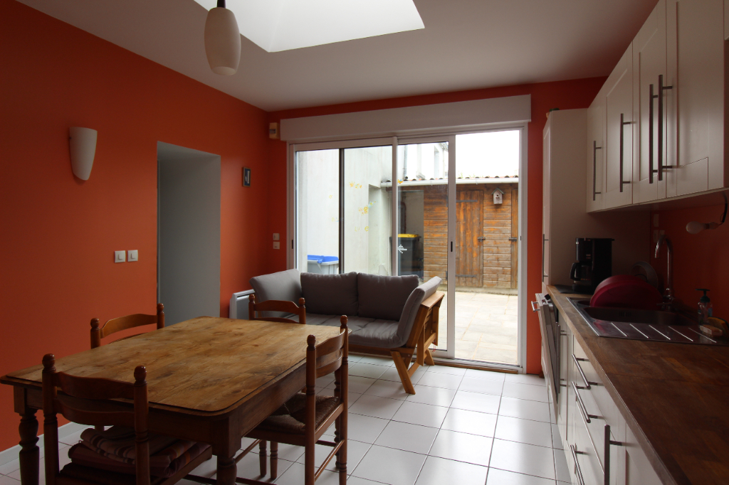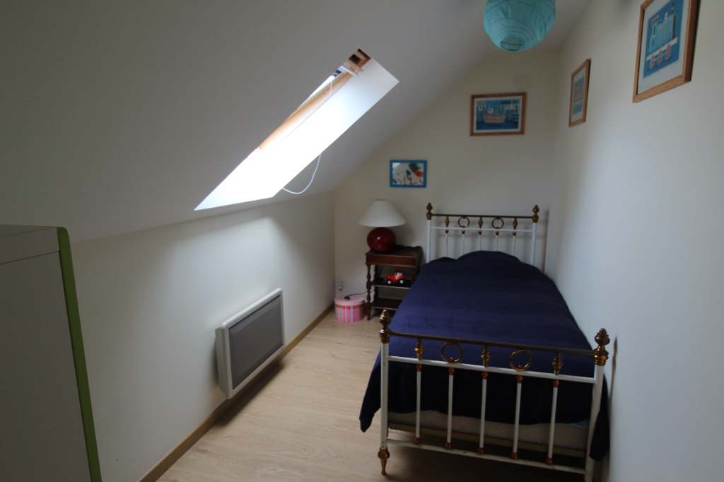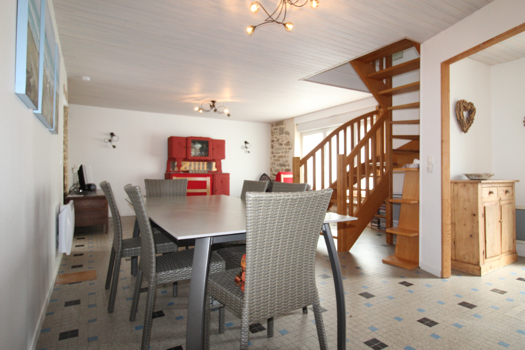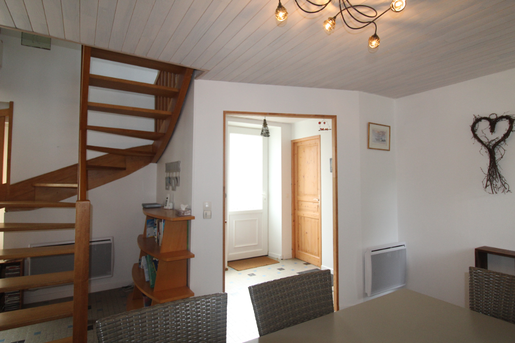 Jolie maison de ville à proximité des groupes scolaires et extra scolaires, du GR, la plage du Porzou à pied, des commerces, comprenant une entrée avec placard, un salon séjour avec rangement, une cuisine aménagée et équipée donnant sur une cour privée de 15 M2 (SUD OUEST) avec cabanon, à l étage 2 chambres, un bureau, une salle de bains avec wc.