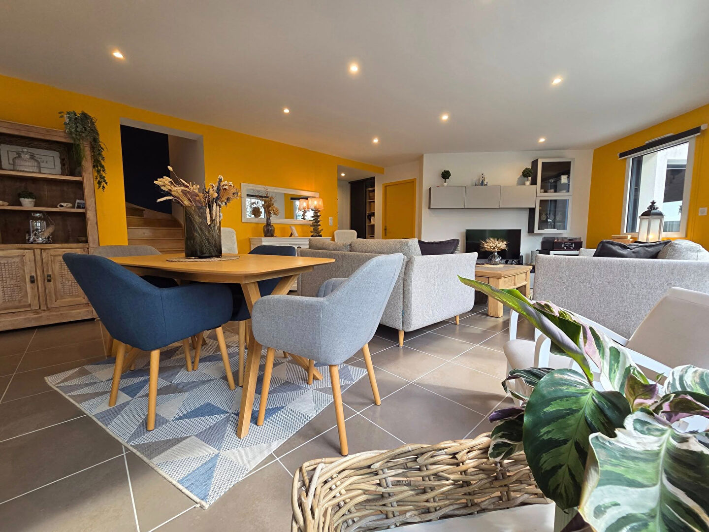 Un vaste salon-séjour baigné de lumière, prolongé par de grandes baies vitrées ouvrant sur le jardin,
