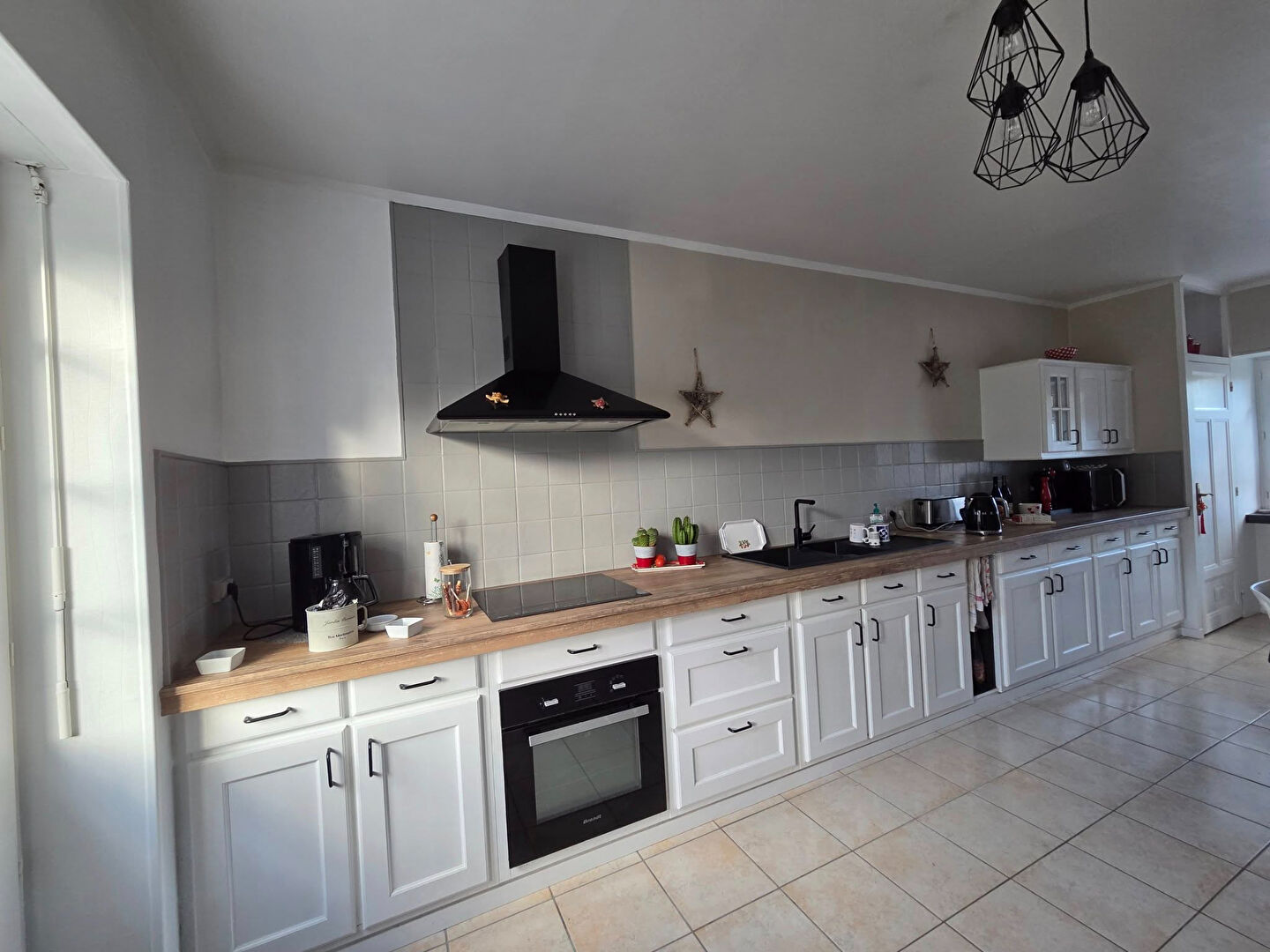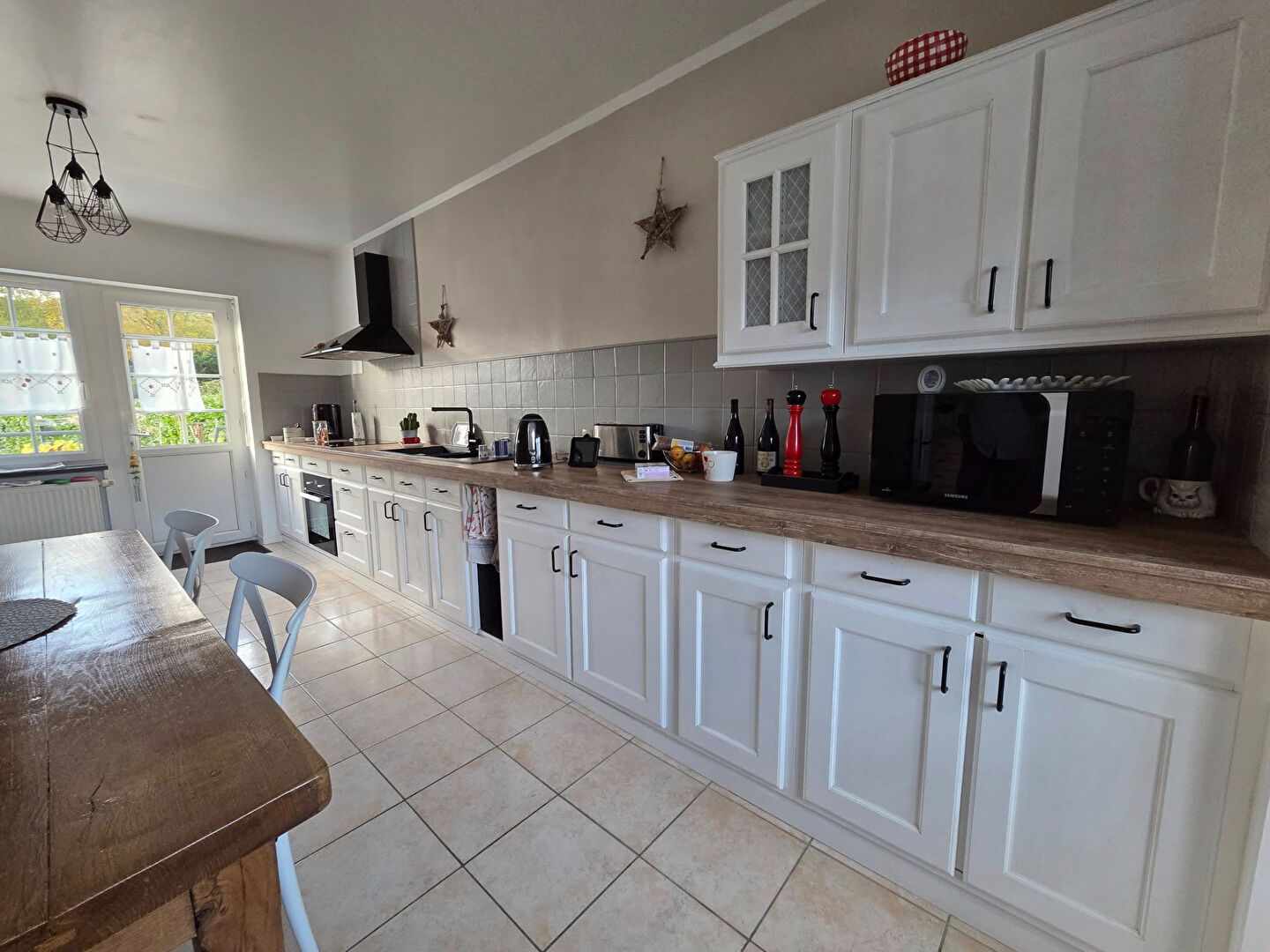 Belle cuisine aménagée et équipée de 20 m², baignée de lumière, qui s’ouvre directement sur la terrasse de 50 m² et le grand jardin exposé Sud-Ouest.