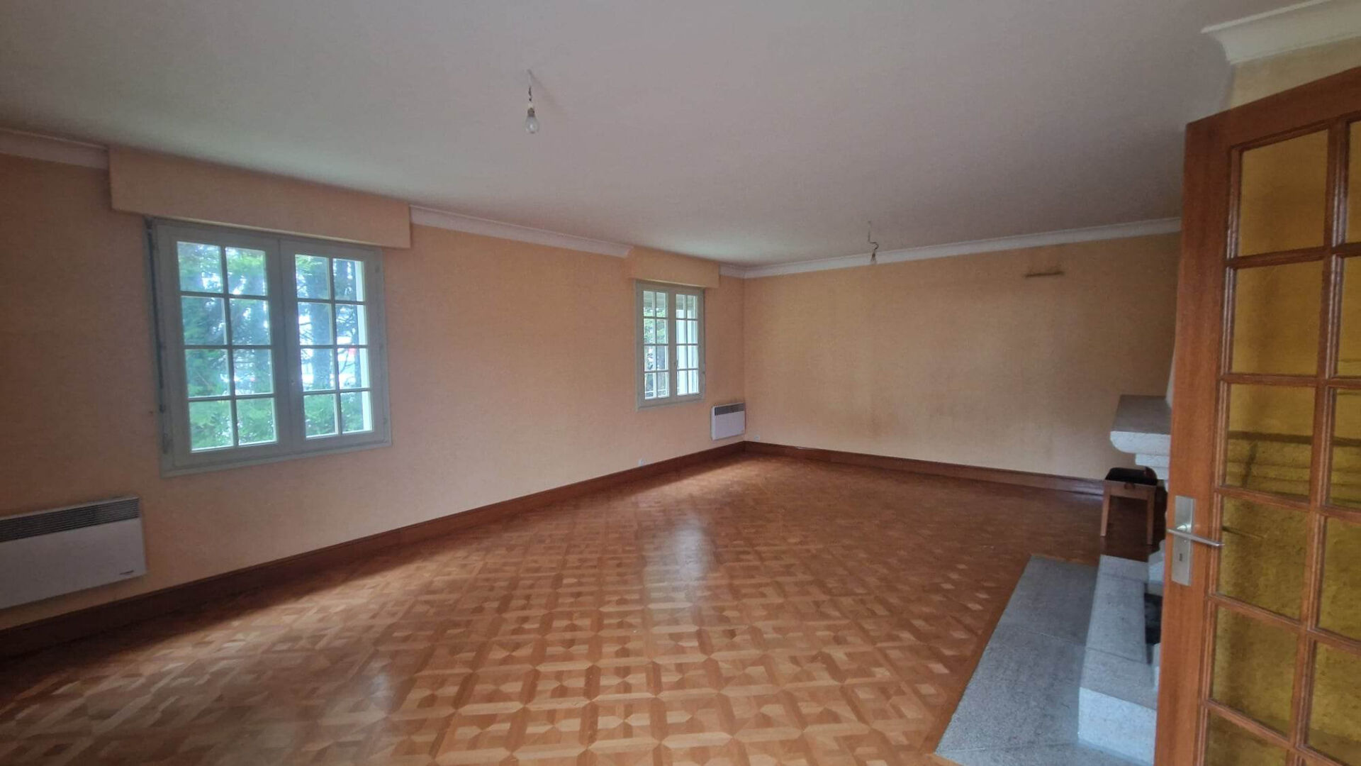 Salon-séjour lumineux de 36 m² avec cheminée, ouvrant sur une terrasse en composite,