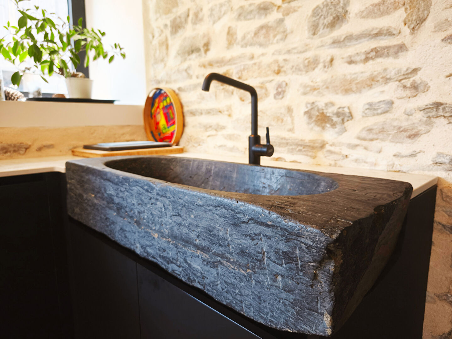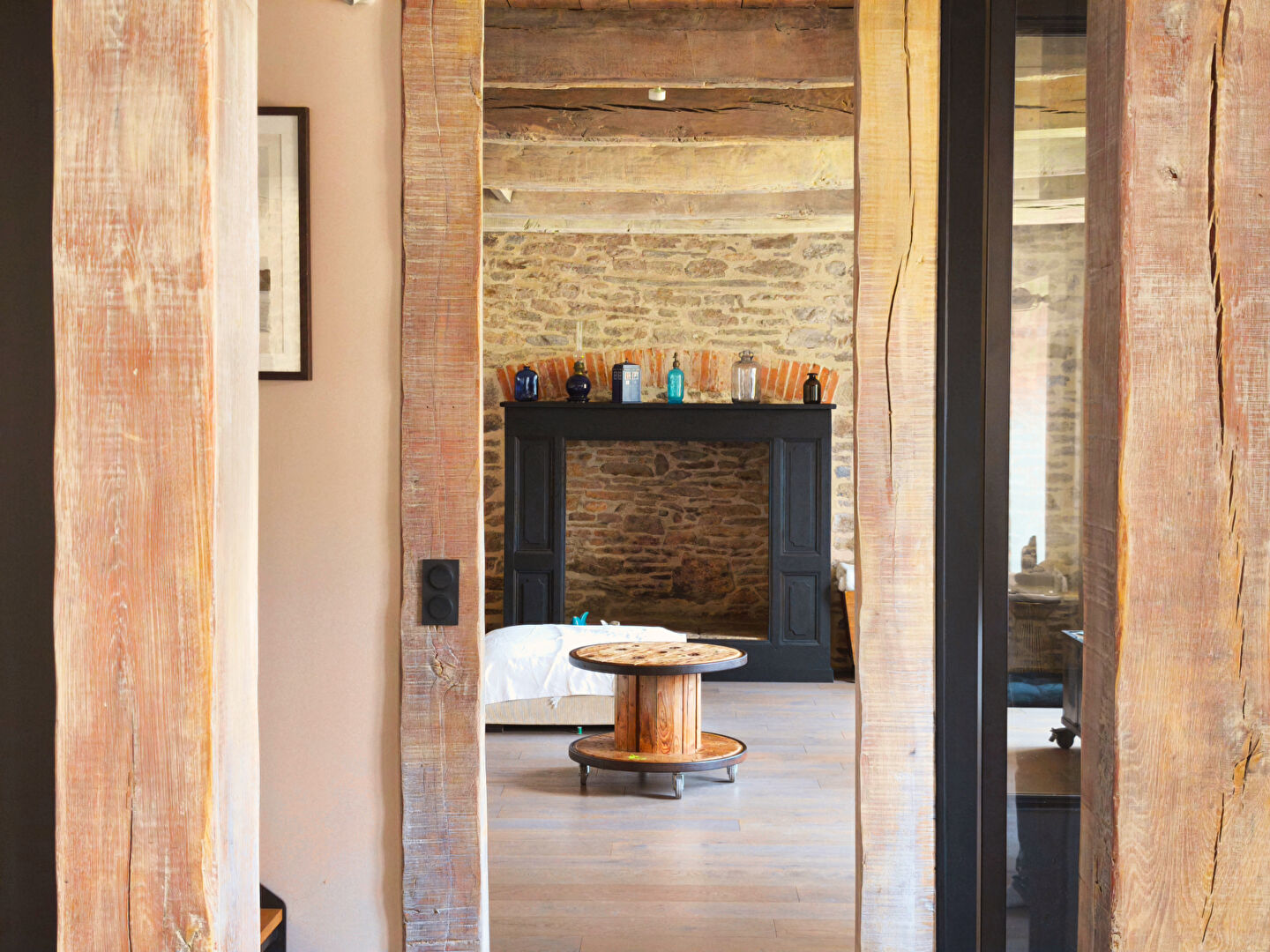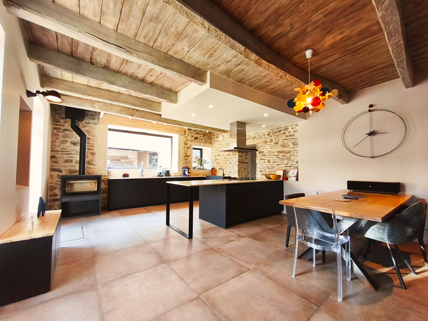 La maison principale (env. 200 m²) a été rénovée avec goût : poutres, pierres, volumes lumineux, cuisine haut de gamme et cheminée d’époque.